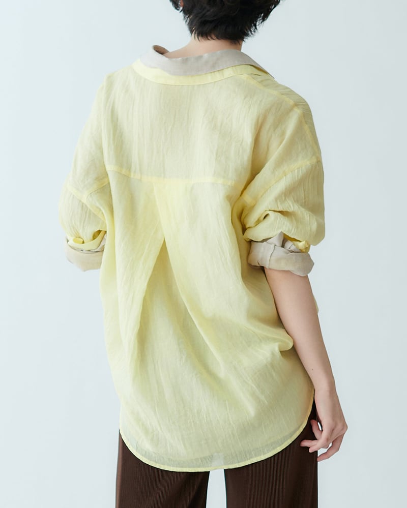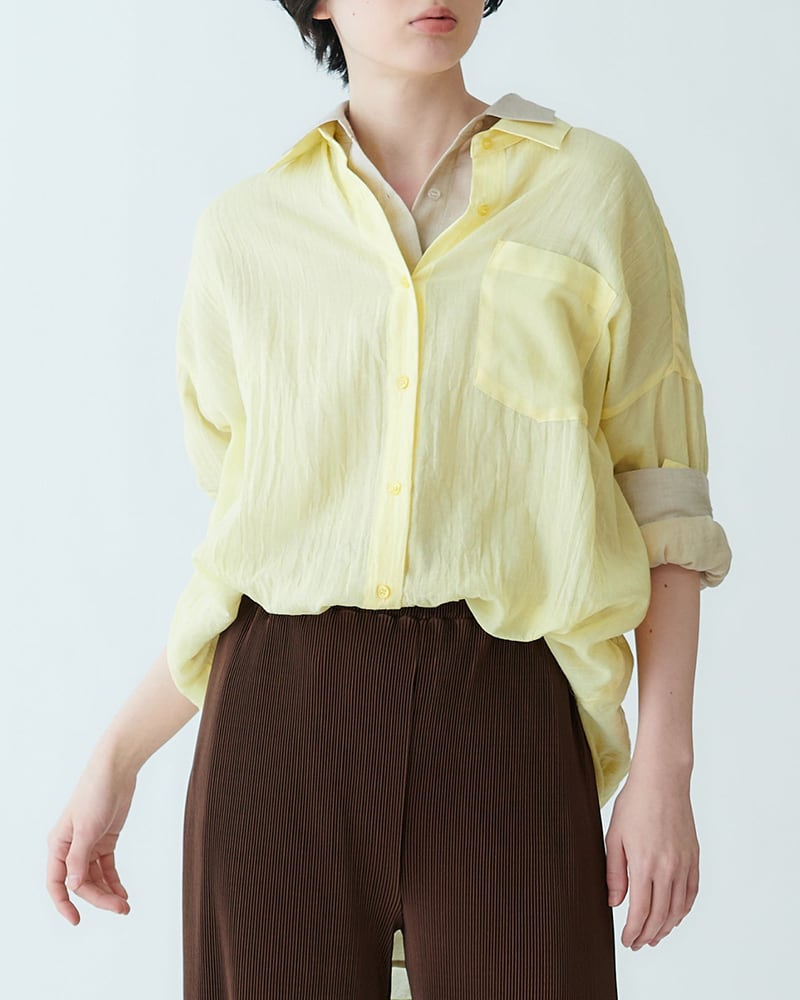 Size:38 ⾝幅55cm 着丈70cm ゆき丈71cm Color : Blue, Yellow, White ポリエステル83% 綿17% E10114 鮮やかなカラーが魅力のカラーシャツ。 羽織りとしても1枚着としても着回し自在な一着です。 素材は、凹凸のある表面が特徴の生地を使用。 軽やかで涼し気な印象を与え、肌離れが良いため、汗ばむ夏場でもベタつかず快適に着用いただけます。 大人のリラックスしたサマースタイルに。 袖をロールアップして抜け感を出す着こなしもおすすめです。